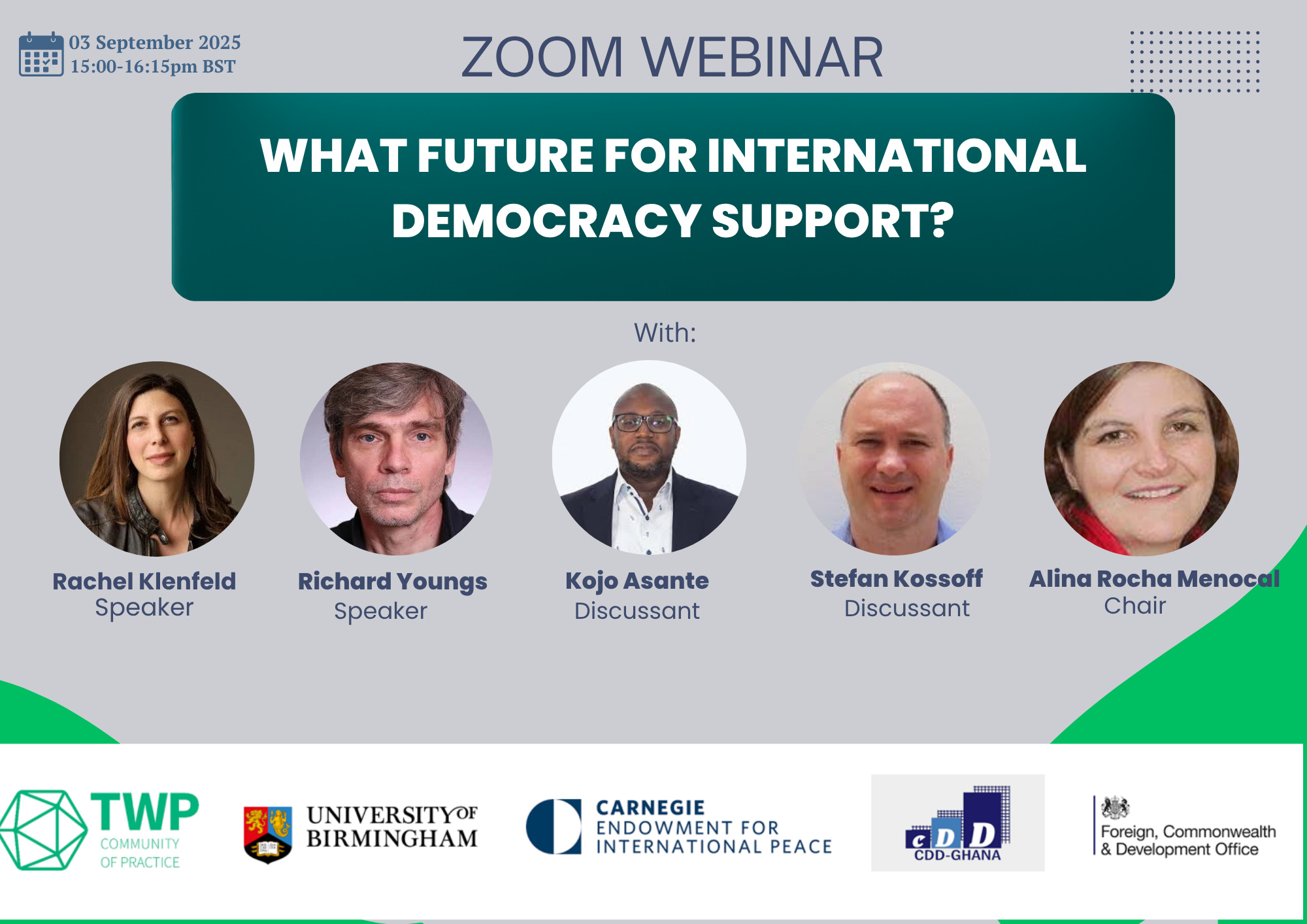 In this webinar, hosted by the Thinking and Working Politically Community of Practice in collaboration with the Carnegie Endowment for International Peace, Dr. Rachel Kleinfeld and Dr. Richard Youngs, both Senior Fellows at CEIP’s Democracy, Conflict, and Governance Program, will explore whether and how necessity may be turned into opportunity, drawing on their recent paper : “What Future for International Democracy Support?”, co-authored with Thomas Carothers.